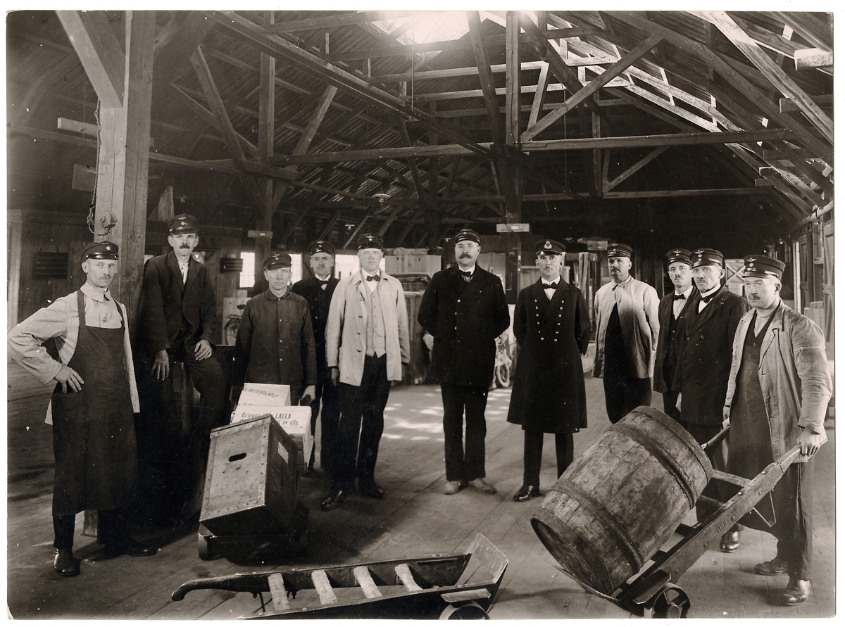 Titel: Stationsinspektor Gustaf Dahlström med personal i Linköpings fraktgodsmagasin.