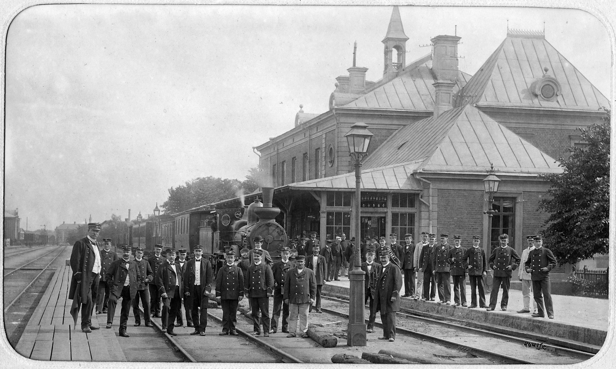 Titel: Gruppfoto av stationspersonalen i Linköping sommaren 1904.