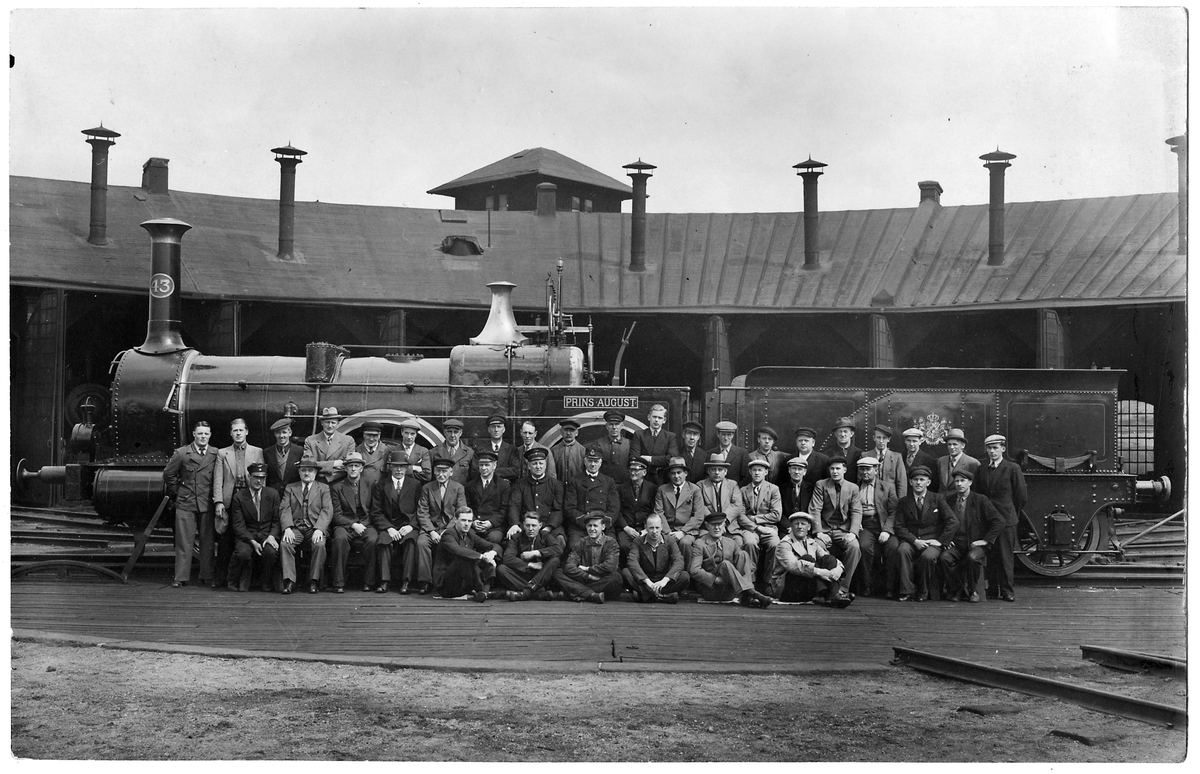 Personalen framför Statens Järnvägar, SJ B 43 "Prins August" i Tomteboda. Här syns lok med ny skorsten efter orginalmodell, renoverade hytten och pannan.