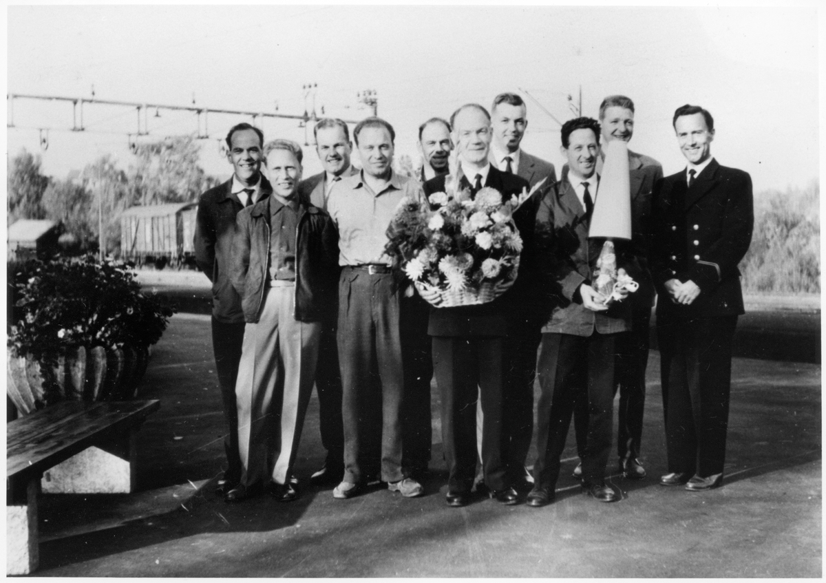 Förste Kontorist Torsten Jönsson hyllas på sin sista dag. Statens Järnvägar, SJ.