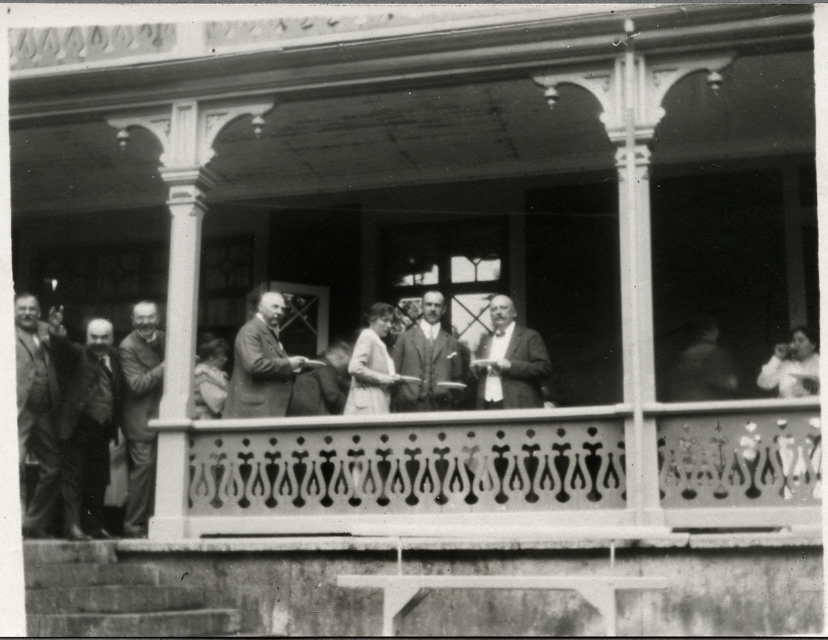 Titel: Ledamöter av Svenska Järnvägsföreningen på hotellverandan i Råbäck.