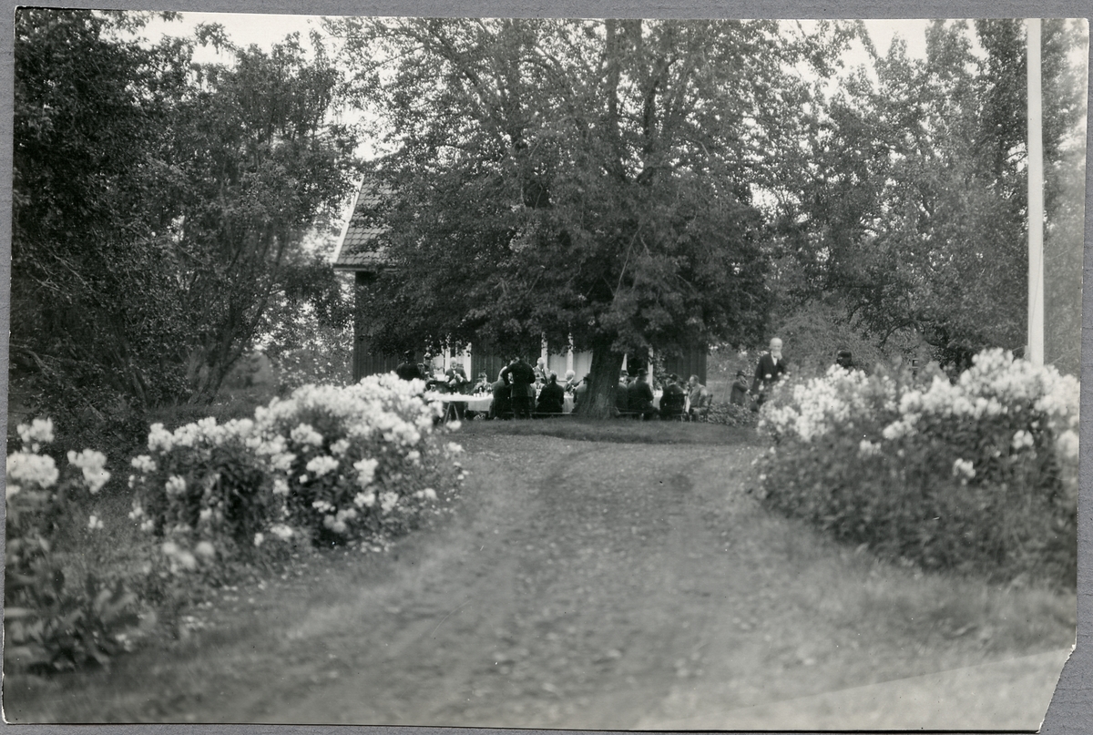 Konung Gustaf V och Konung Alfons XIII av Spanien jaktsällskap lunchar på Kronojägarebostad på Fagerhult i Hunneberg.