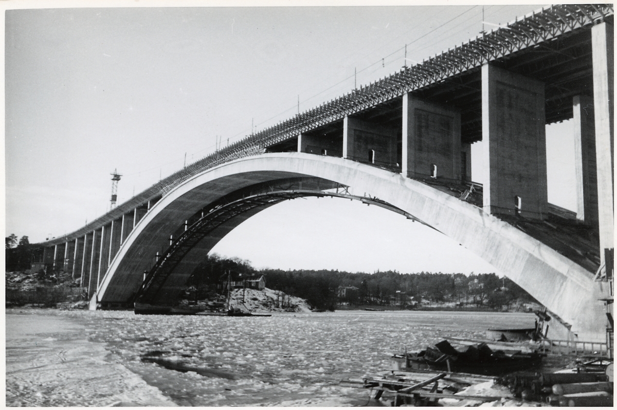 Titel: Byggnation av Tranebergsbron. Bron sträcker sig över Tranebergssundet mellan Kungsholmen och Traneberg.