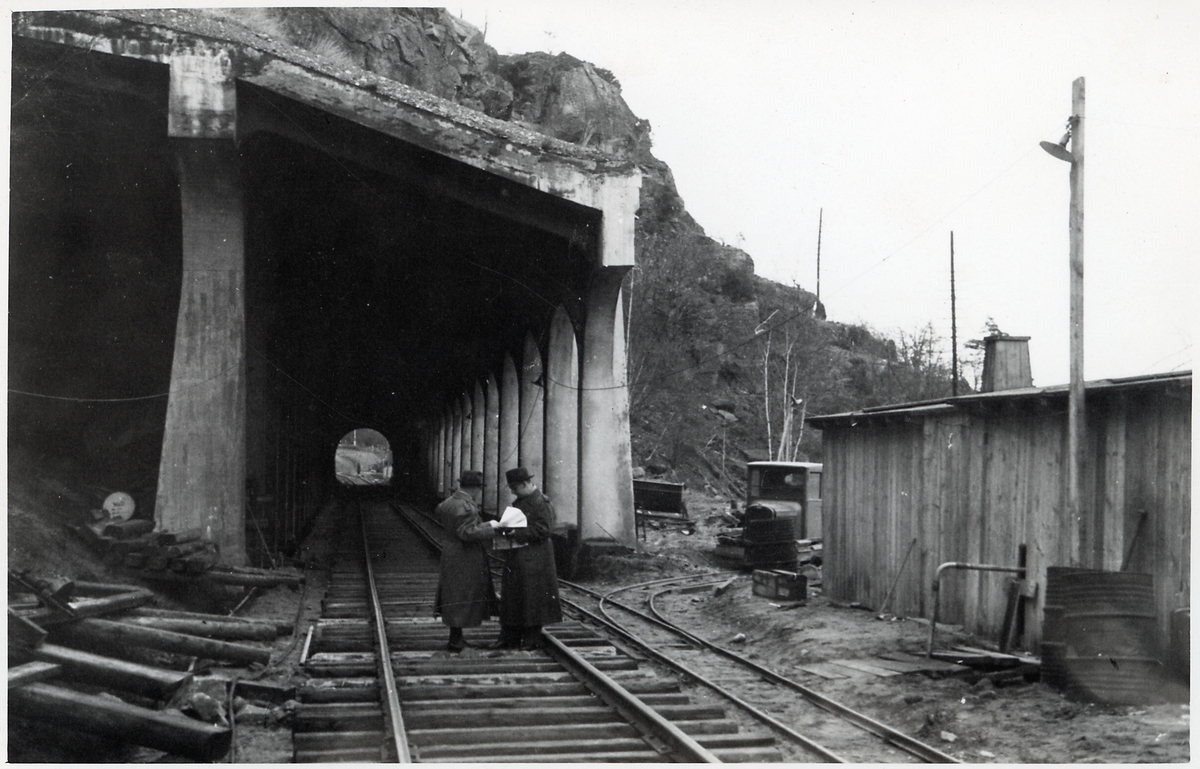 Bohusbanan inför elektrifieringen, banarbete vid galleriet av Lahagentunneln på linjen mellan Stenungssund och Ljungskile.