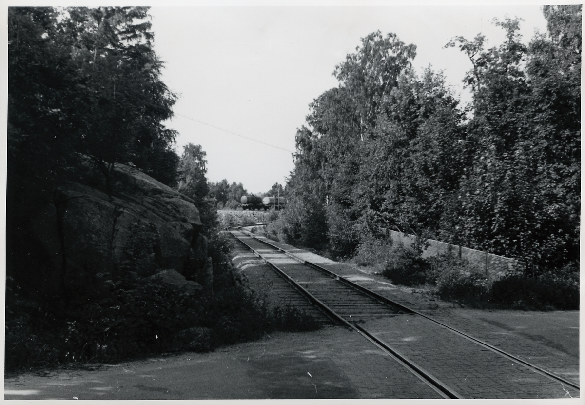 Järnvägsövergång, i bakgrunden tankvagnar.