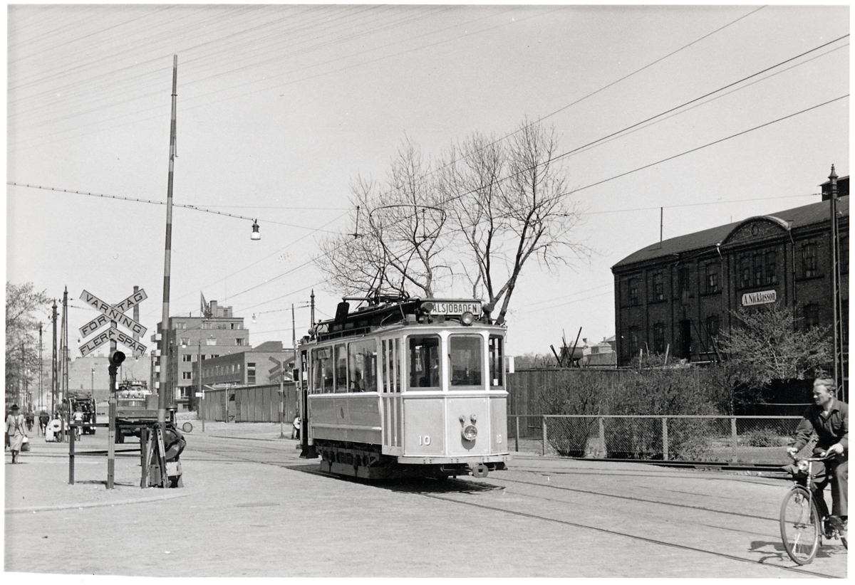Järnvägsövergång, spårvagn korsar järnvägen. Hälsingborgs Stads Spårvägar, HSS A2 10.
