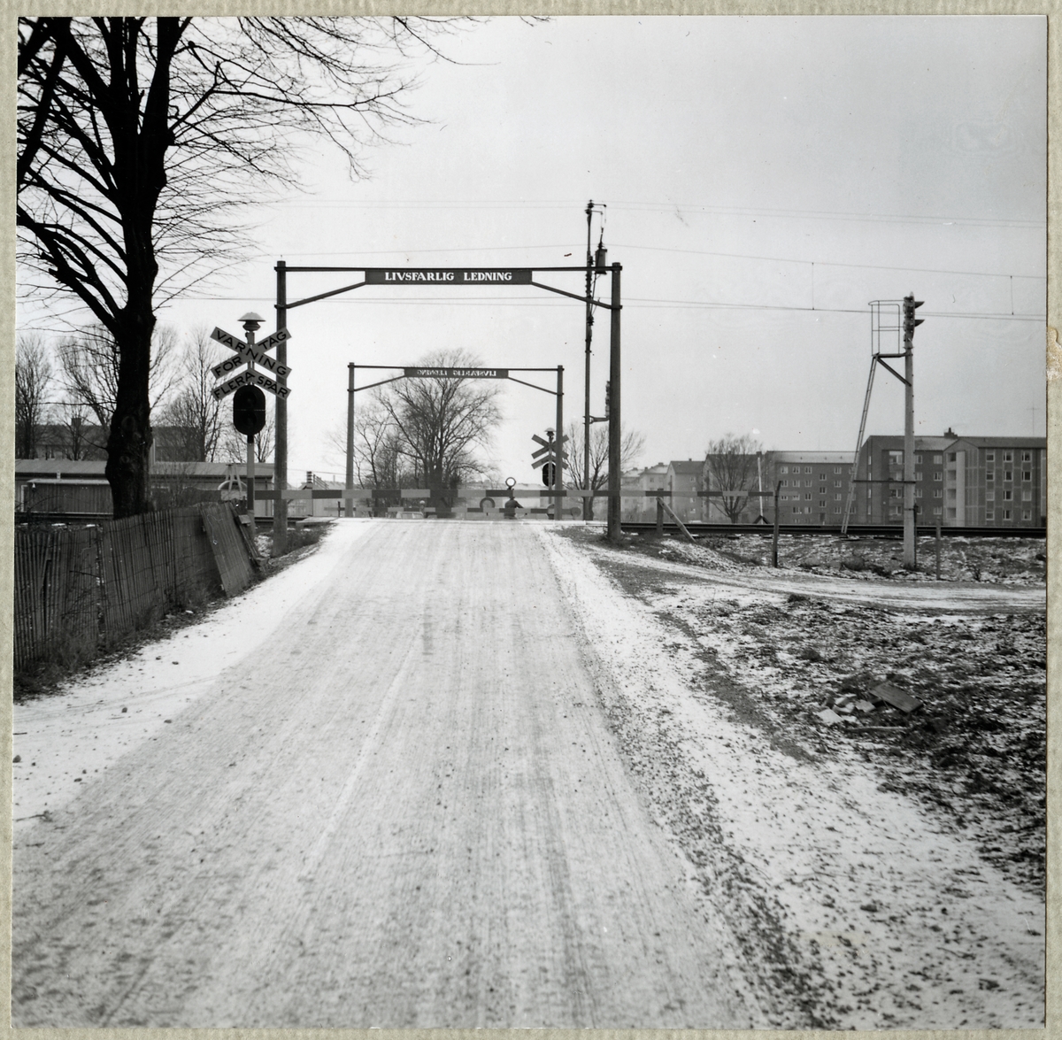 Järnvägsövergång vid Rosengårdsvägen, sedd från gatan.