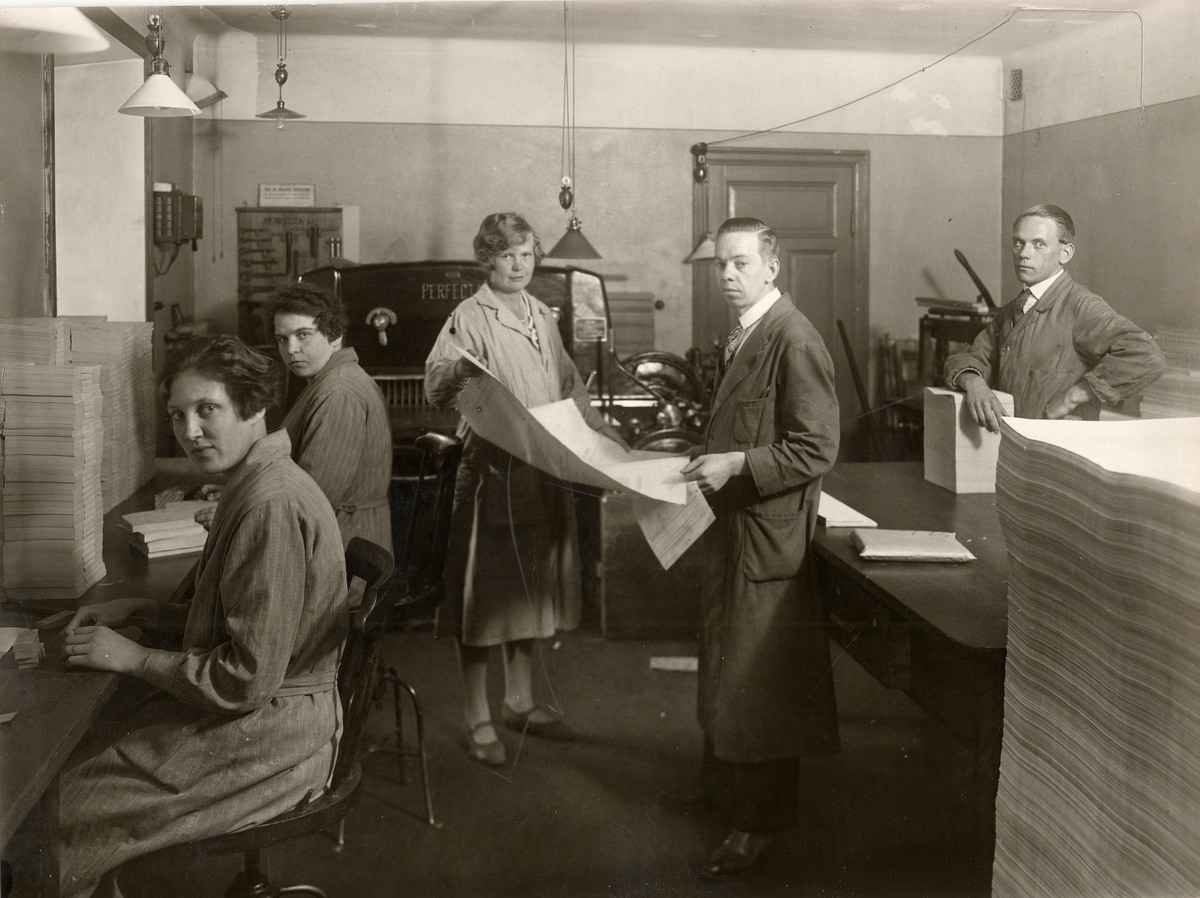 Från vänster: Bokbinderska Astrid Ed, bokbinderska Calla Pettersson, bokbinderska Alma Källström, bokbindare S. Strömberg, bokbinderiarbetare S. Pettersson.