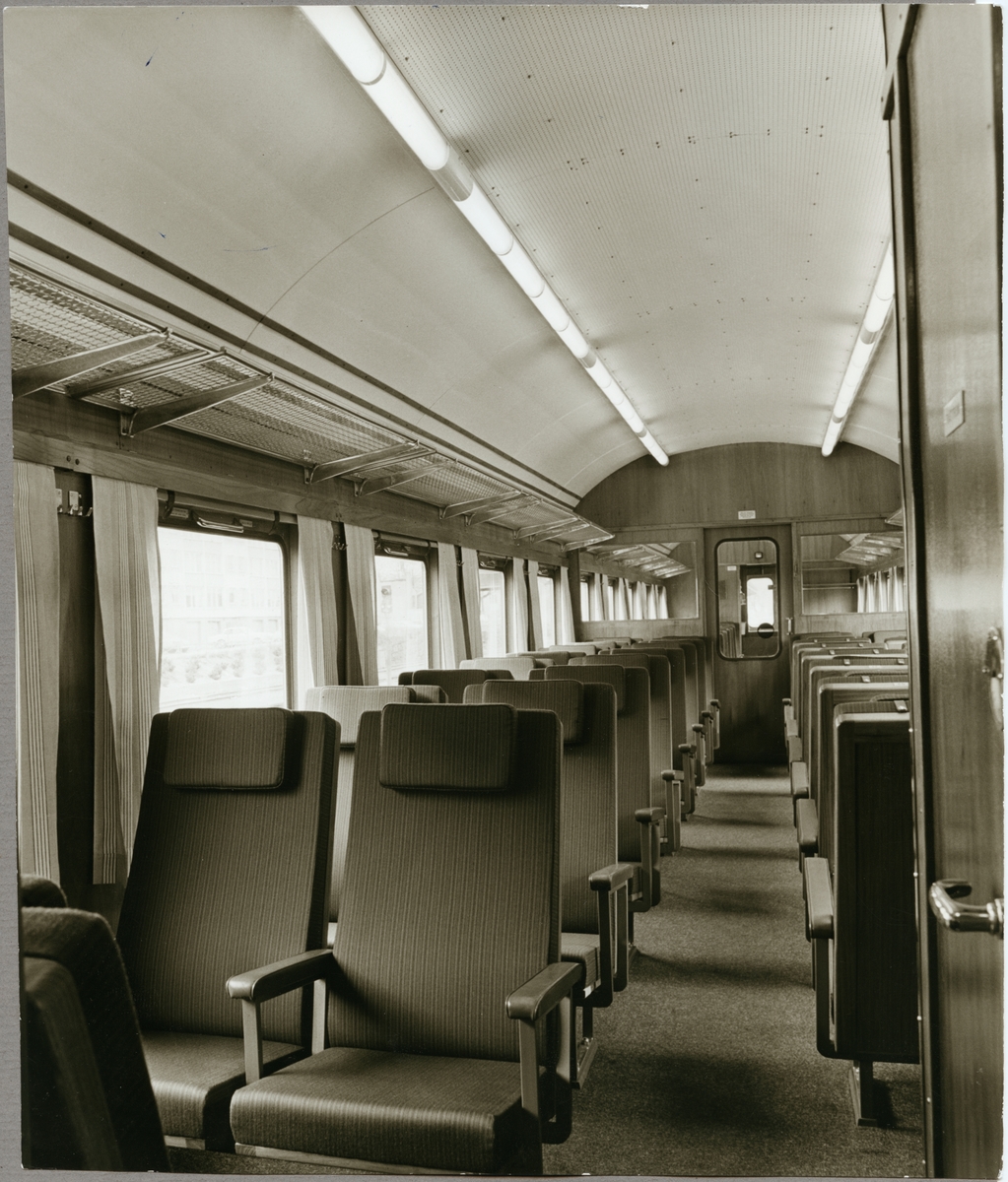 Interiör av en Trafikaktiebolaget Grängesberg - Oxelösunds Järnvägar, TGOJ personvagn.