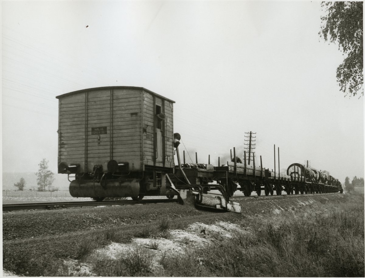 Titel: Diket som gjorts utefter banvallen fylls igen med nerlagd telefonkabel.