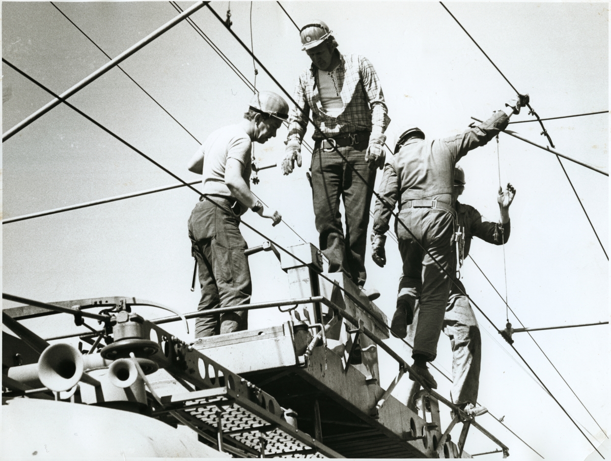 Installation av kontaktledning av från vänster Mats Andersson, Uno Andersson, Henning Öhlin samt Åke Larsson.