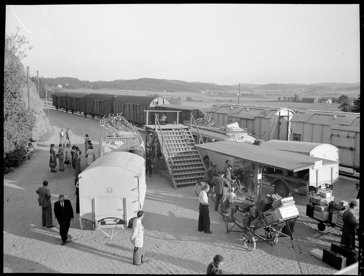 Statens Järnvägar, SJ bussar samt resenärer och bagage på bangård. Kylvagn SJ H 26320 till höger.