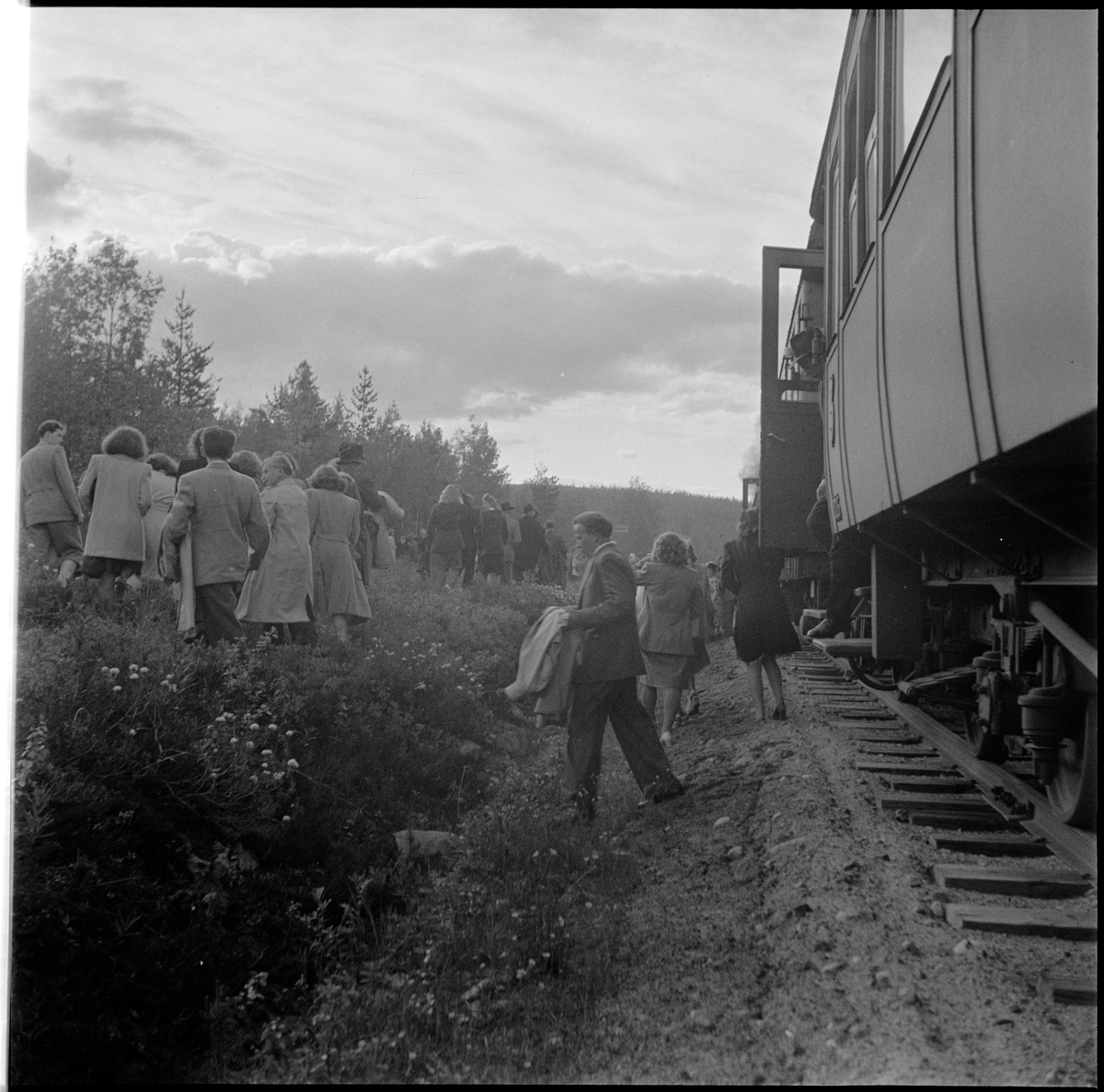 Ett tåg har stannat vid gångvägen upp till Luppioberget, på linjen mellan Övre Niemis och Alkullen.