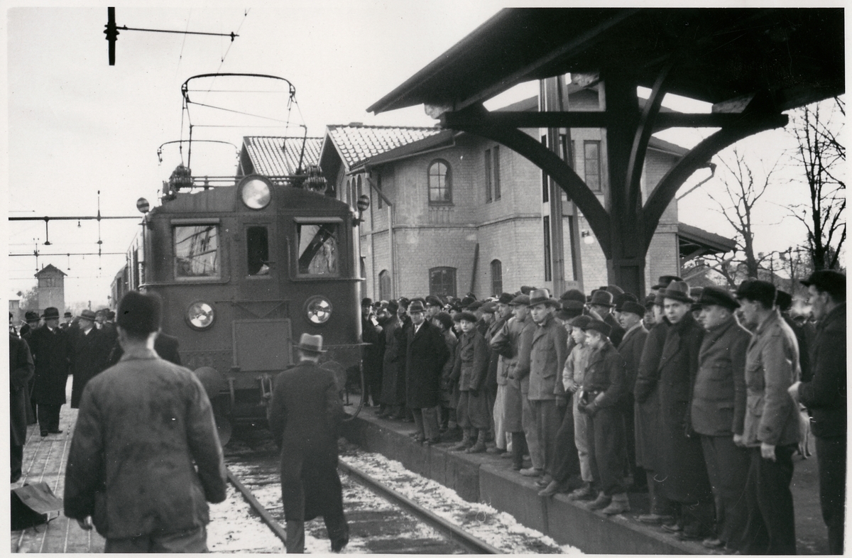 Första eldrivna loket på Kristinehamns järnvägsstation. På spåret står Statens Järnvägar, SJ Dk 433.