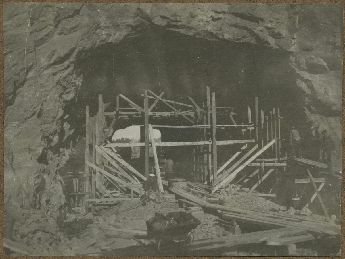Dubbelspårsbyggnaden mellan Alingsås - Olskroken. Ubbaredstunnel på linjen Floda - Norsesund. Västra inslaget till östra tunneln. Valvställningar för förstärkning.