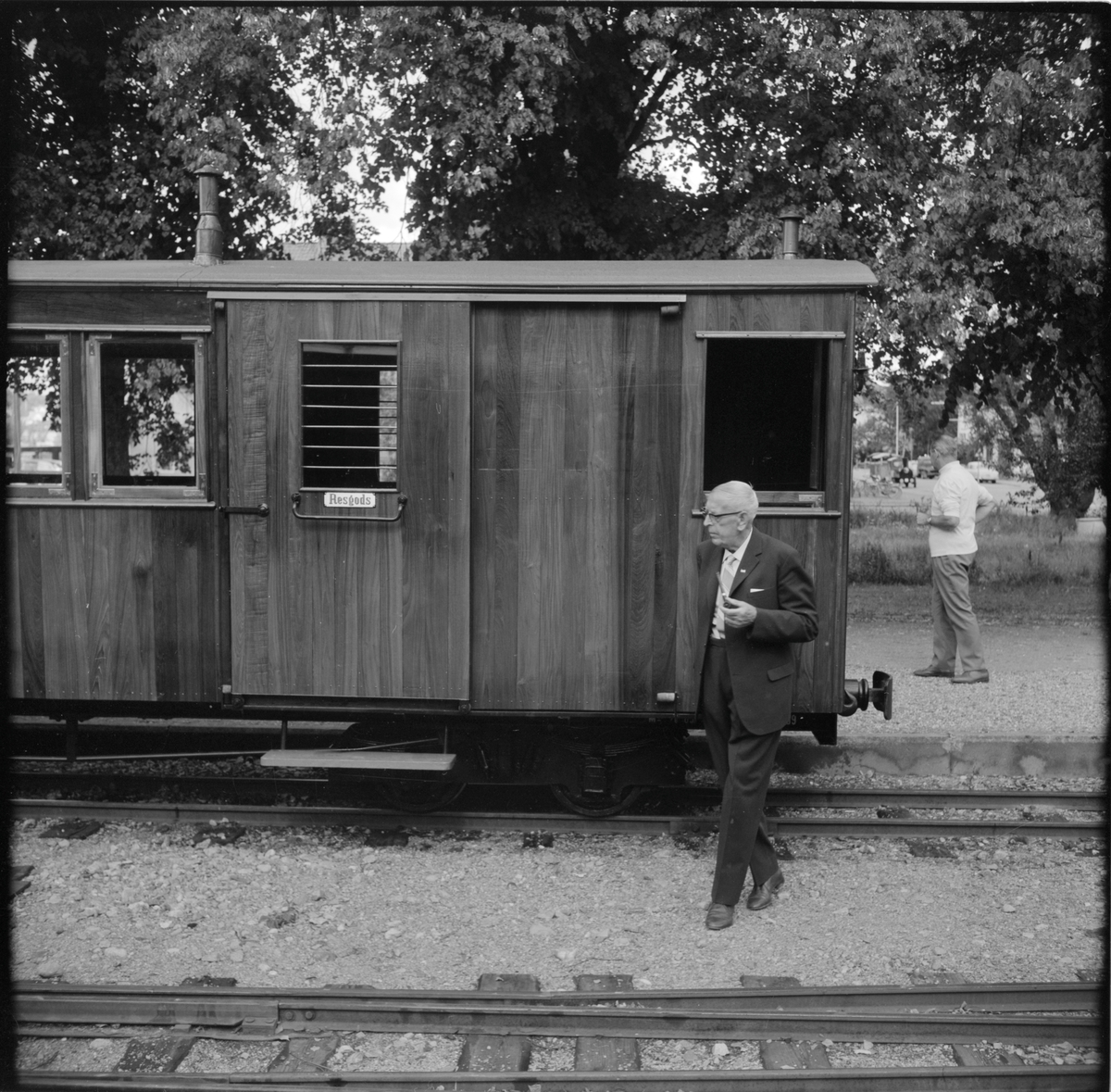Man utanför resgodsdel på Helsingborg - Råå - Ramlösa Järnväg, HRRJ CFo 7 vid Museijärnvägen, Östra Södermanlands Järnväg, ÖSlJ i Mariefred.
