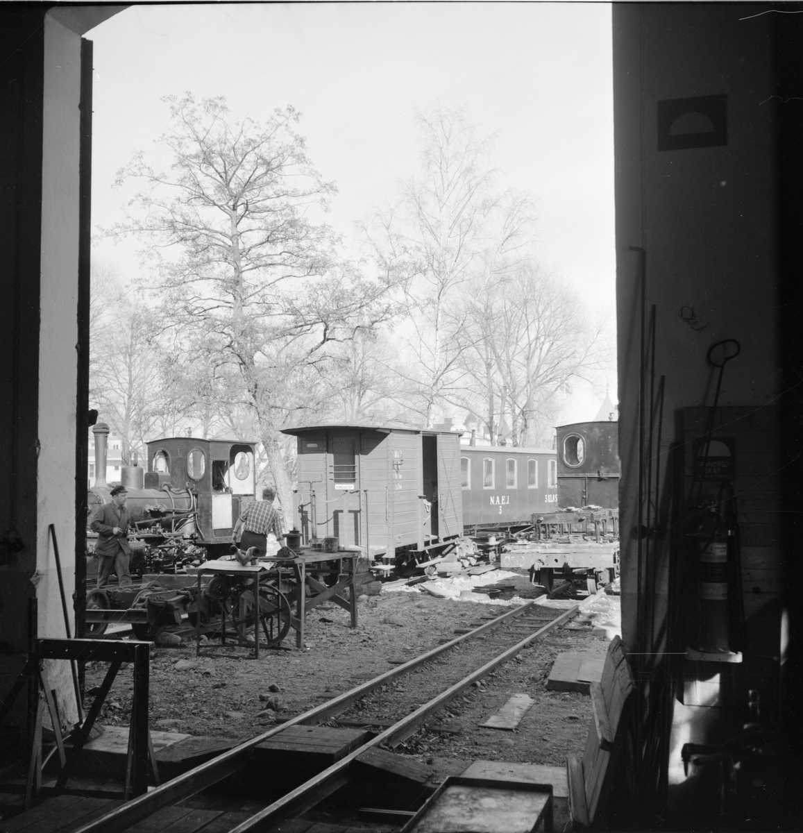 Utanför verkstaden i Mariefred ses Museijärnvägen, Östra Södermanlands Järnväg, ÖSlJ fordon: Lok 1 "Lotta" till vänster, Anneberg - Ormaryds Järnväg, AOJ godsvagn 3 i mitten och till höger lok 3 "Dylta". Bilden är tagen inifrån verkstaden.