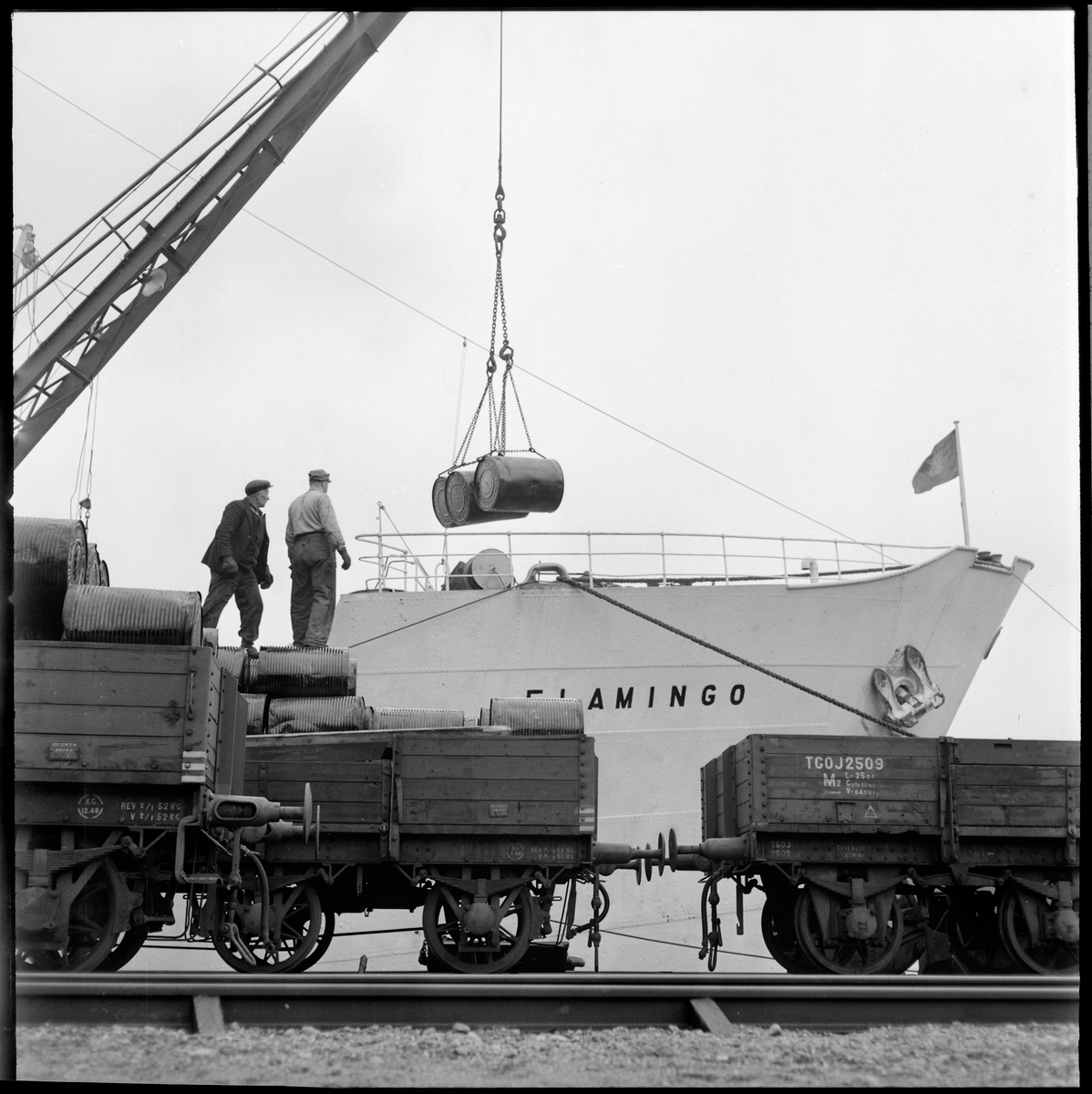 Lasning av tunnor mellan Fartyget Flamingo ochTrafikaktiebolaget GrängesbergOxelösunds Järnvägar, TGOJ M2 2509.