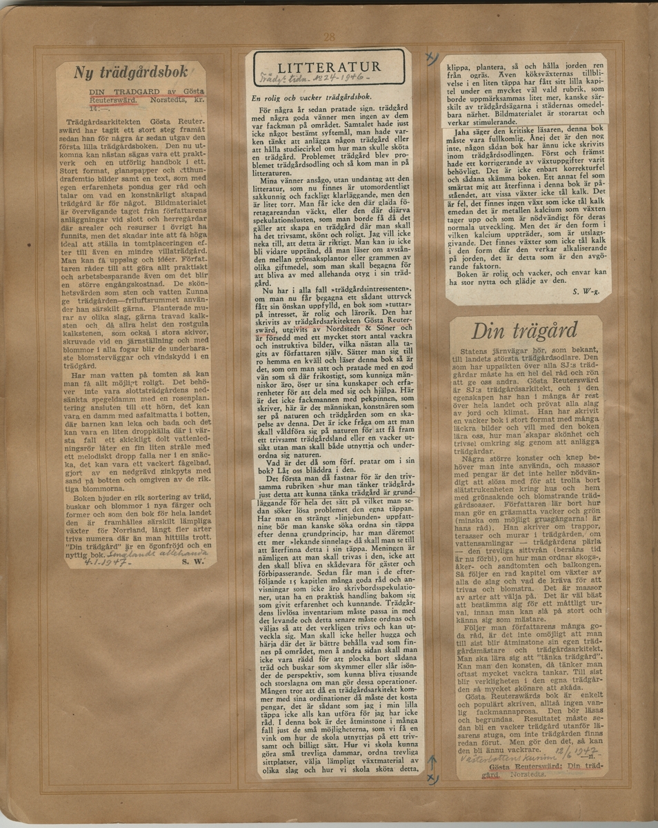 Tidningsklipp ur "Uppsatser om trädgårdar m.m. som på ett eller annat sätt beröra Gösta Reuterswärd. Samlade av Ernst Hj."