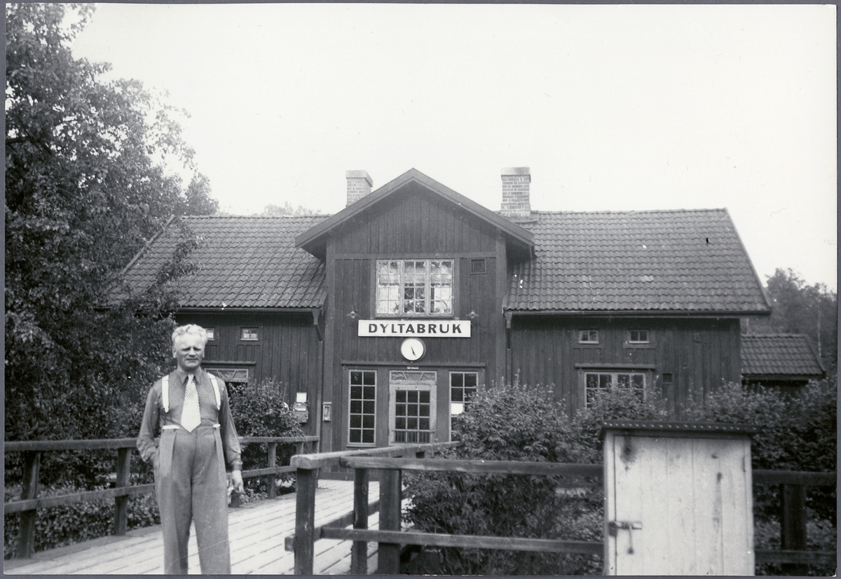 Dylta bruk stationshus. Stationen togs i bruk 1856 och var från början en gammal prästbostad. På bilden syns stationsföreståndare Frans Andersson som arbetade på Dylta bruk station från 1942 fram till pensionen 1948.