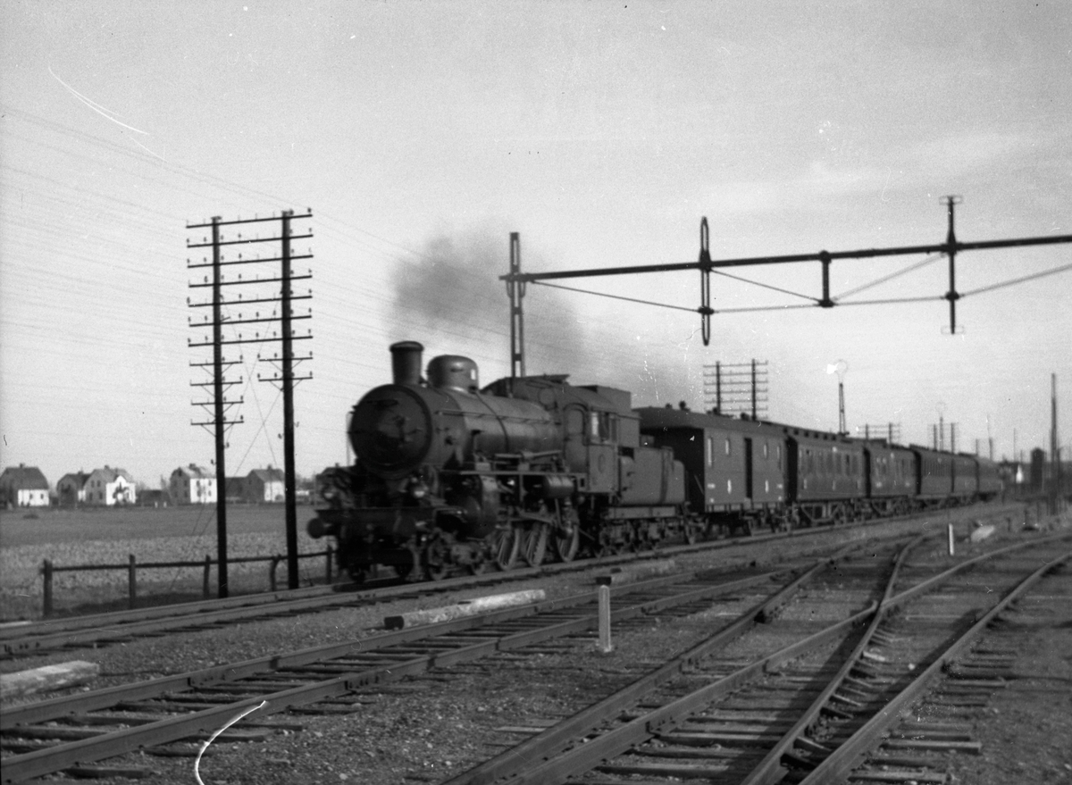 Statens Järnvägar, SJ B 1430 med persontåg Uppsala- Gävle. Kontaktledningsstolpar men inga ledningar