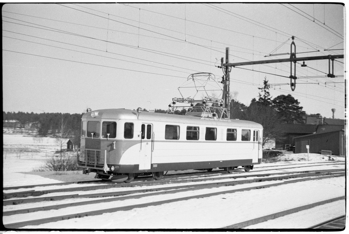 Titel: Statens Järnvägar, SJ Yoa1 31. Elektrisk prov-motorvagn utvecklades av ASEA och ASJ. Denna prov-motorvagn insattes i reguljär trafik på ett flertal platser i Sverige, bland annat i Boden och Västerås-Enköpings-området. Proven utföll till SJ fulla belåtenhet och beslut togs att konvertera 30 stycken dieselmotorvagnar till elektriska motorvagnar.