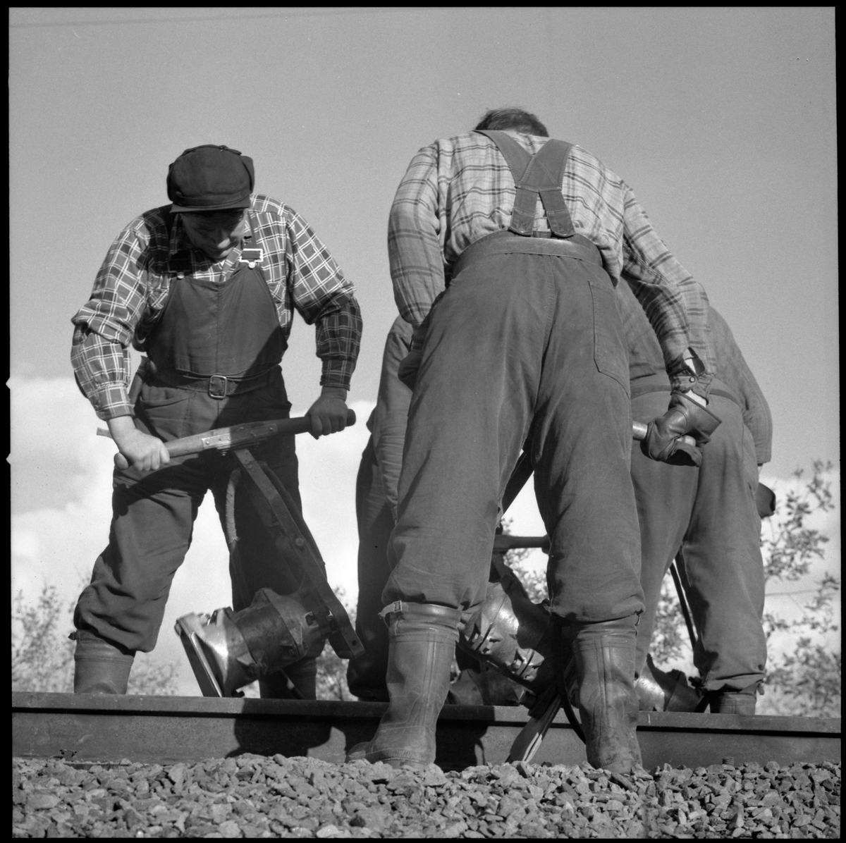 Banarbetare justerar ballasten under spåren med vibratorspett.