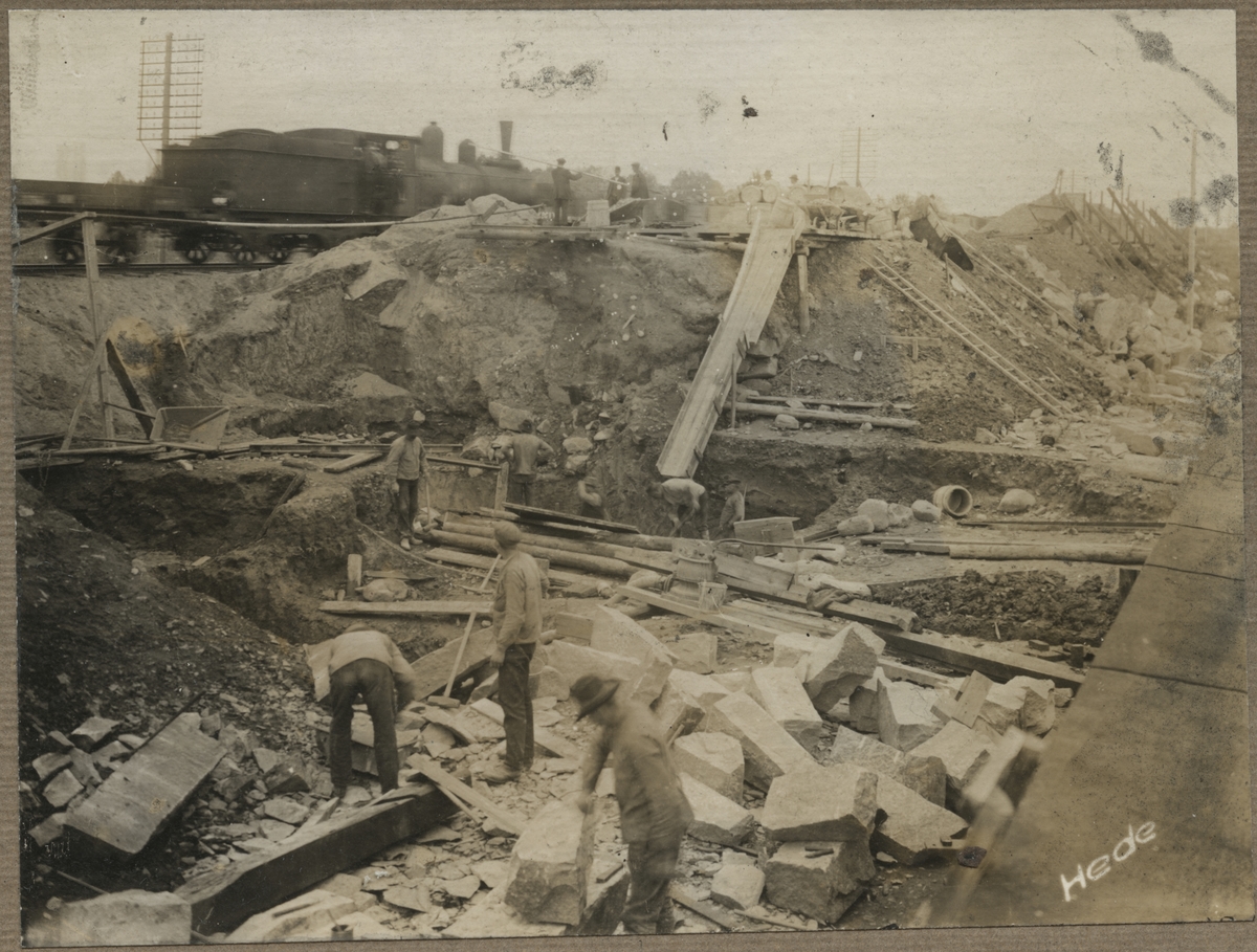 Dubbelspårsbanbyggnad Göteborg - Alingsås. Här har vi arbetets början i Hede, år 1914. Till vänster ses det provisoriska förbigångsspåret.