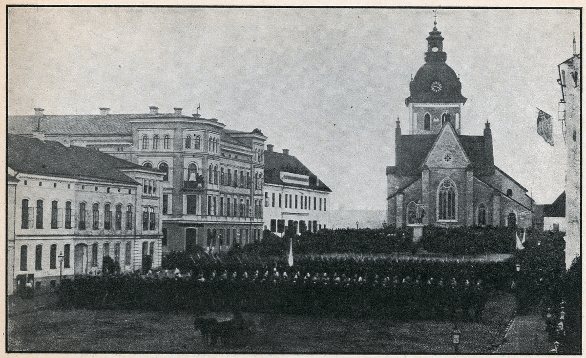Titel: Engelbrektstodens avtäckande utanför Nikolaikyrkan i Örebro.