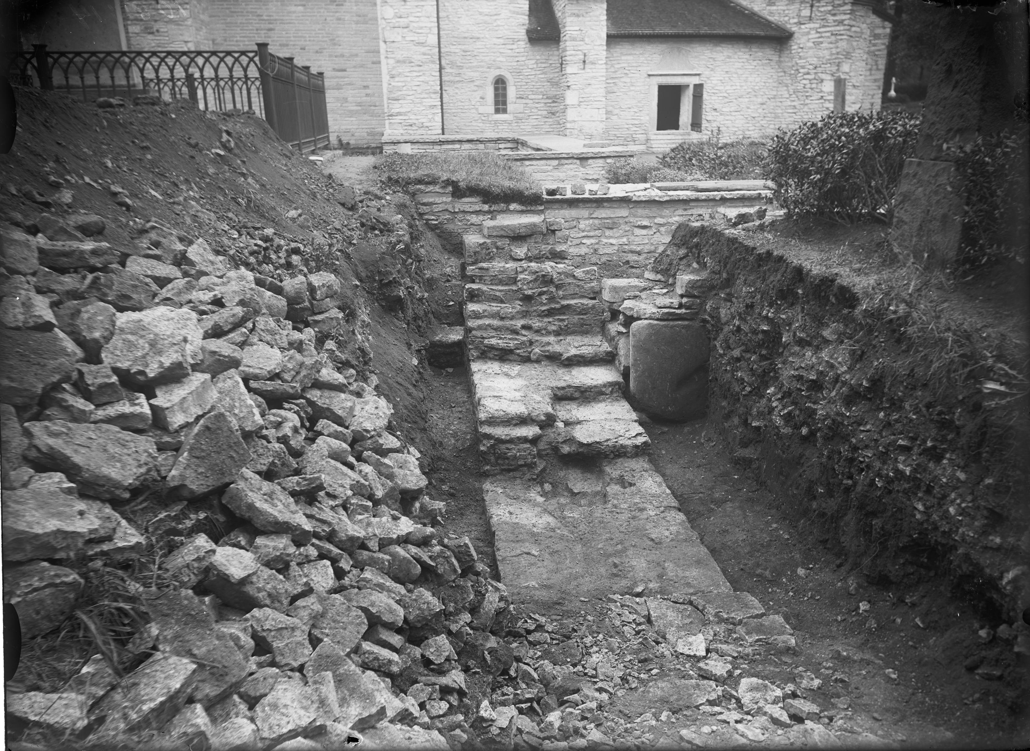 Södra smygen till östra porten och östra muren söderut. Till vänster tillbyggnadens södra mur. Murens sydligaste del under återuppförande. Från söder.