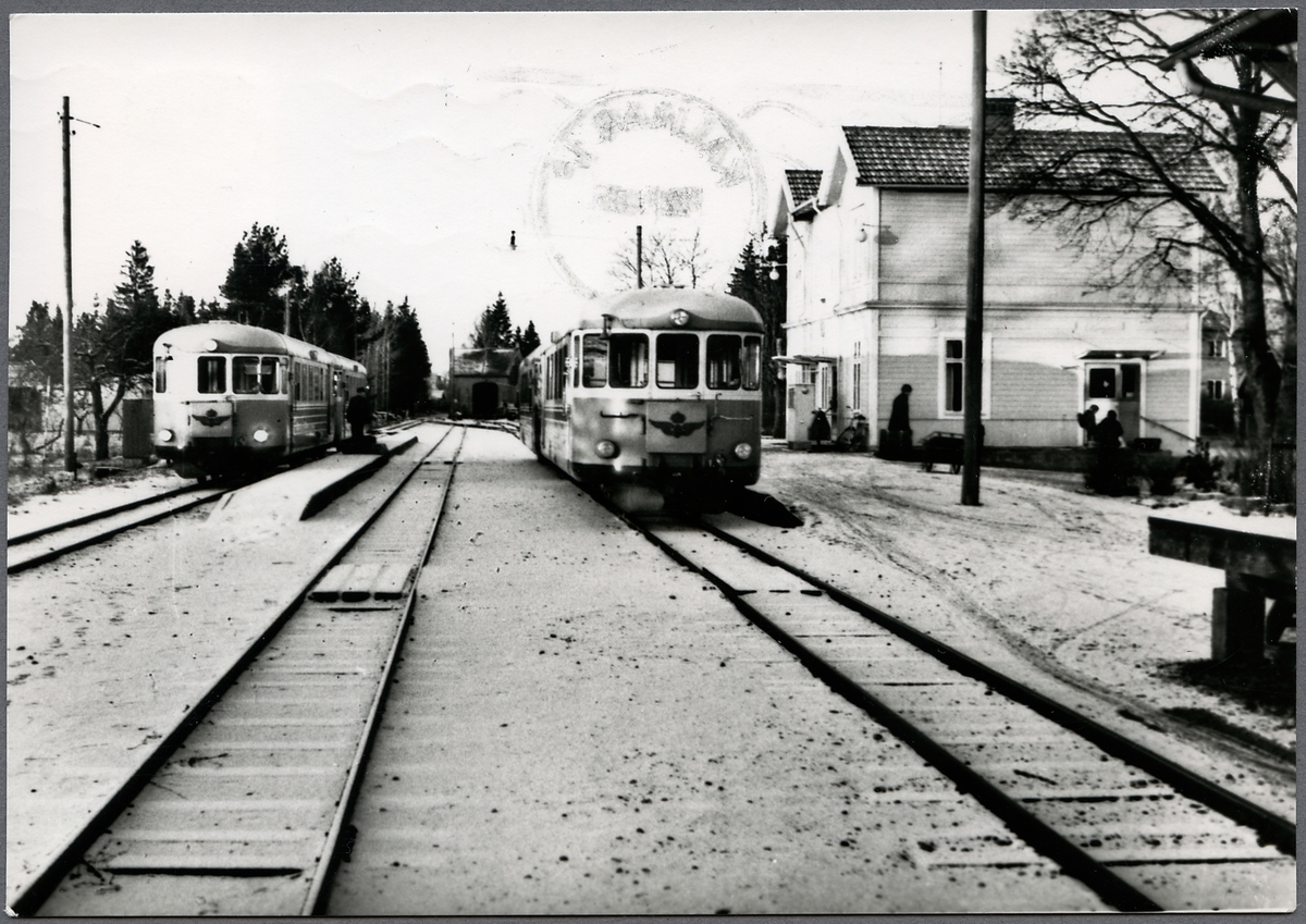 Möte mellan Y 2127 och tåg Y 2126 vid Ålem station på Kalmar - Berga Järnväg, KBJ.