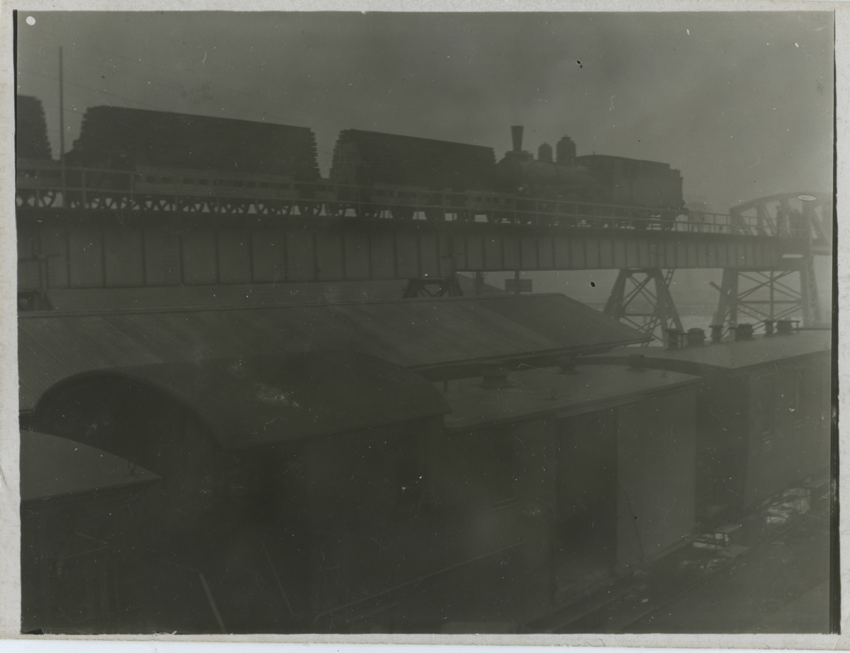 Ånglok med vagnar på provlbelastning på bro över Göta älv.Nuvarande Marieholmsbron byggdes 1908 och togs ibruk mars 1909. Den ersattes av betong 1996.