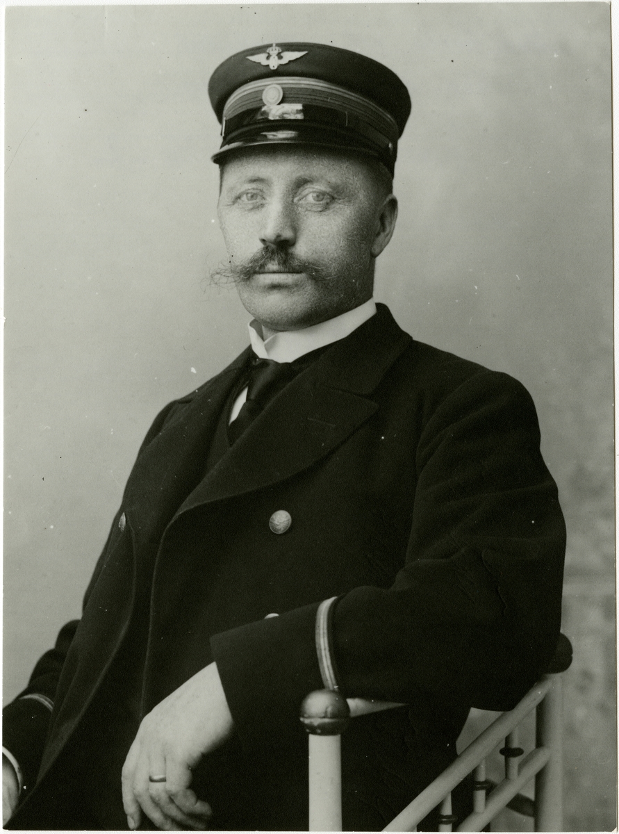 Den första Stationsmästaren i Munkedal 1904 - 1913, Clas Hjalmar Larsson. Uniformering för stationsmästare för 5 klassens station gällande 1909 - 1921.
