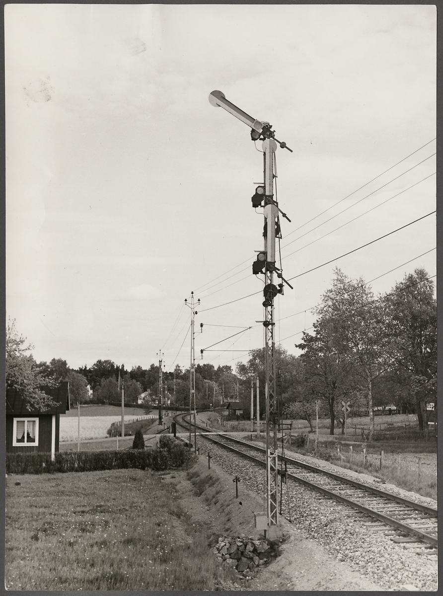 Trevingad semafor som visar körsignal till huvudtågväg.