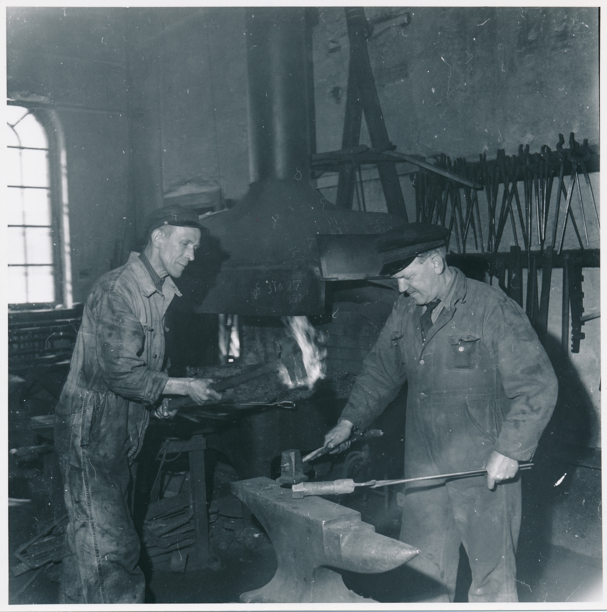 Titel: Text på kort - Rolf Albin Karlström släggar åt verkstadsförman Artur Nilsson.