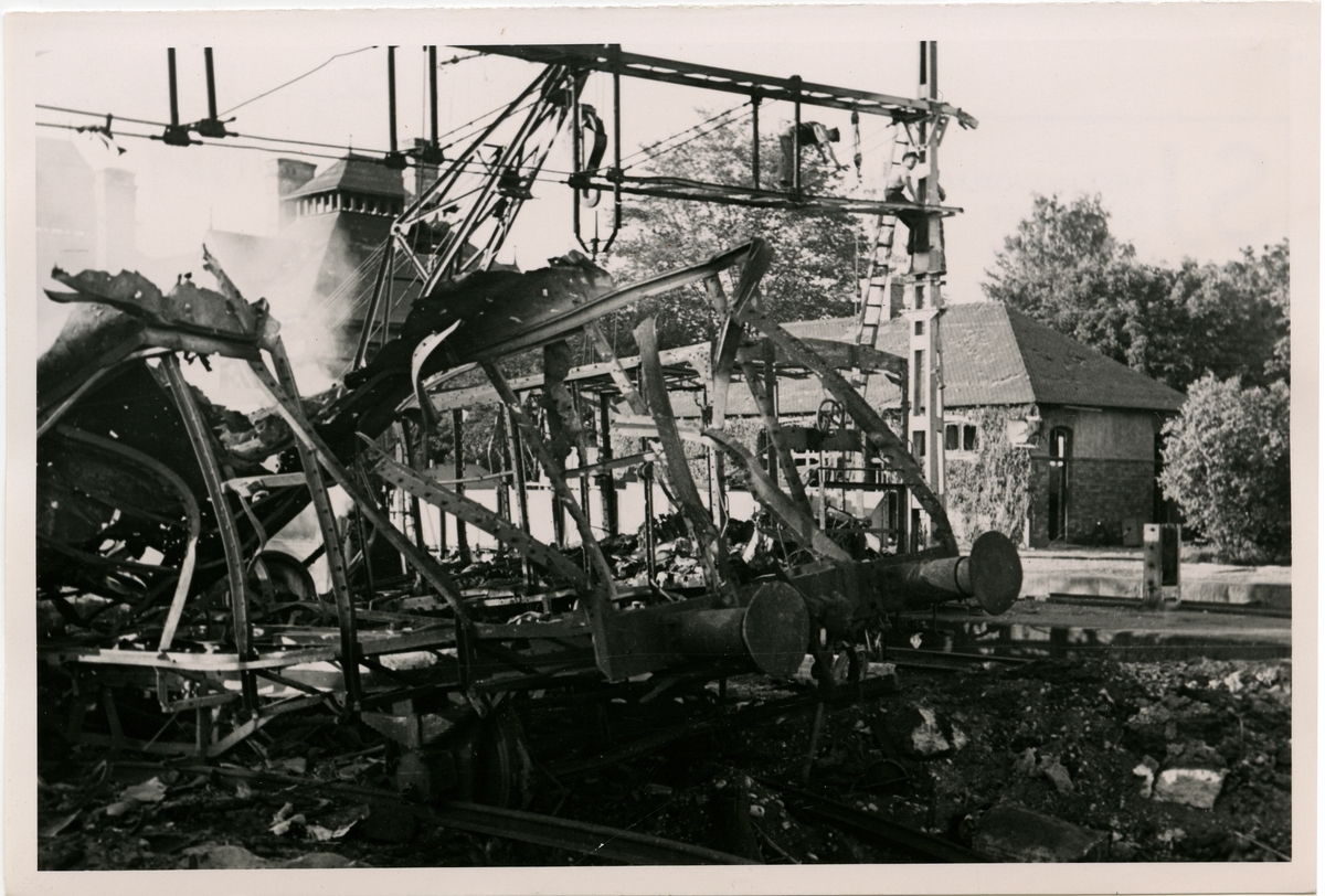 Krylbo-olyckan. Krater, förvriden vagn och räls. Bryggan demonteras.