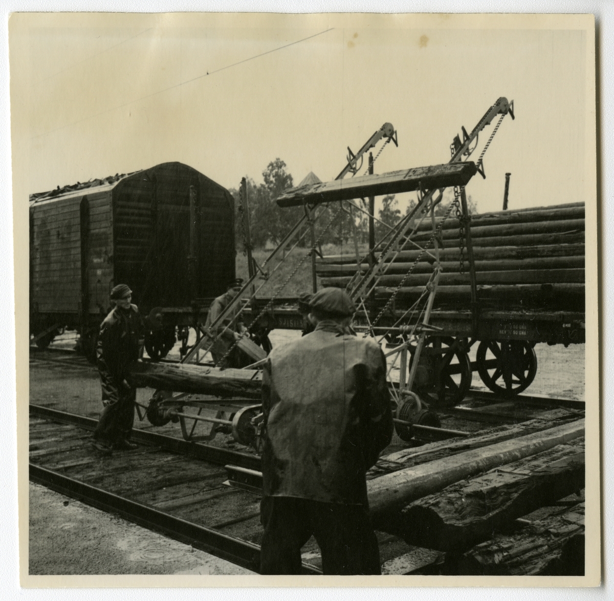 Titel: Tvååker. Statens Järnvägar, SJ godsvagn 15113. Lastning/lossning av slipers.