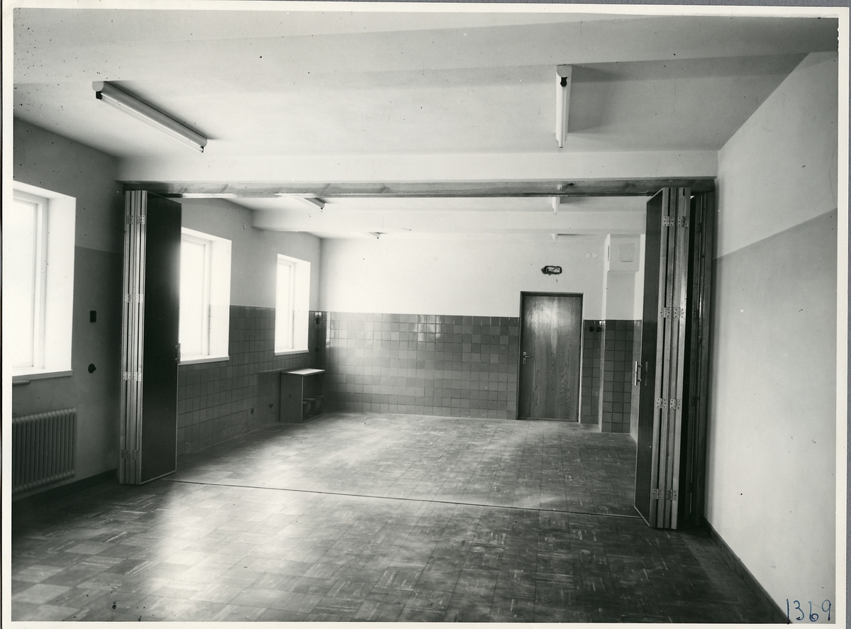 Ystad lokstation, expeditionsbyggnaden. Rum 51 sett från rum 52 med väggen hopskjuten. Dagrum för lokpersonal och undervisningssal.