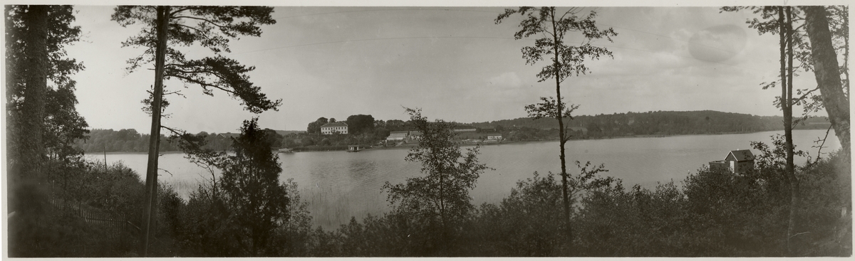 Bild tagen över Rådasjön från södra sidan i Pixbo. I bakgrunden syns Råda säteri. Järnvägslinjen Göteborg-Borås går strax söder om denna plats.