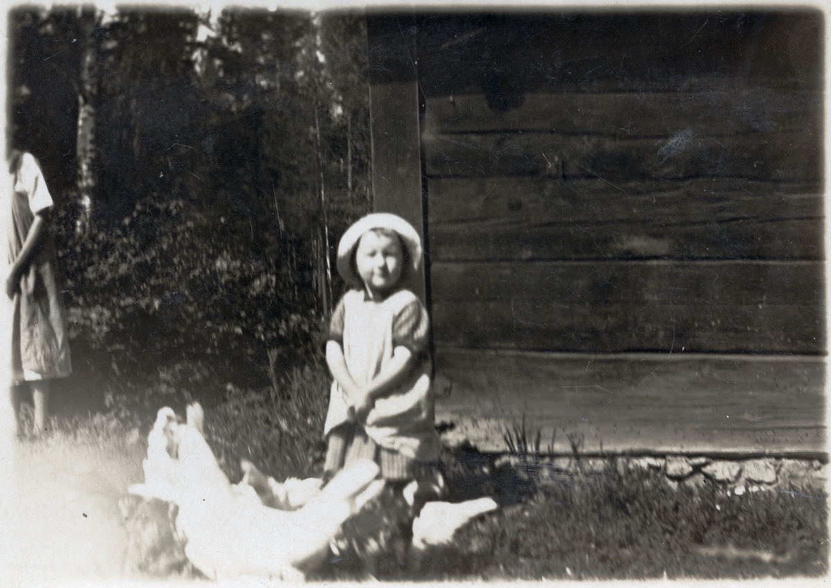 Titel: Bojan 3 år med hönsen i Långsjön. Hönsen är av rasen Minorka.