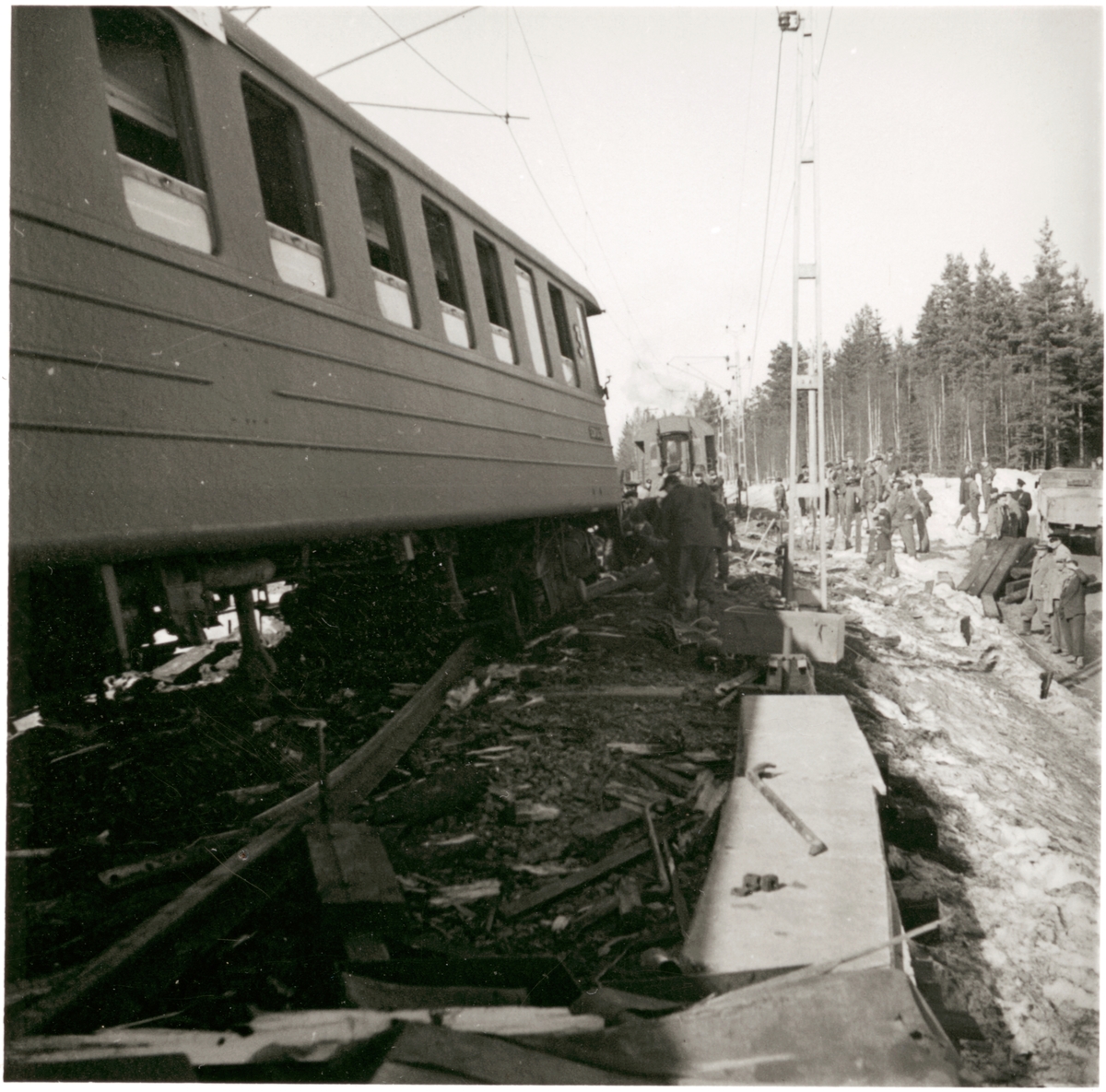 Titel: Vy på urspårad vagn och folksamling efter tågolycka.