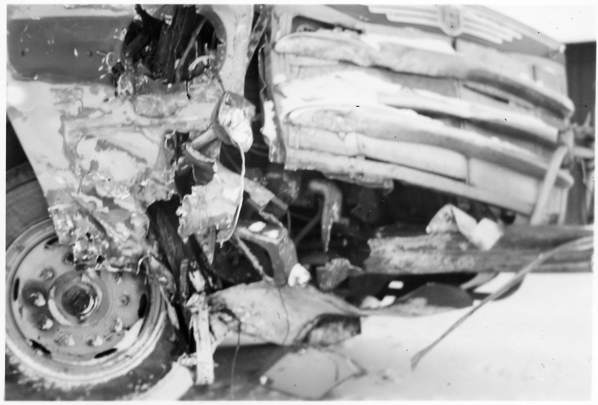 Detaljer på krockskadade bussen Statens Järnvägars, SJ buss 1985.