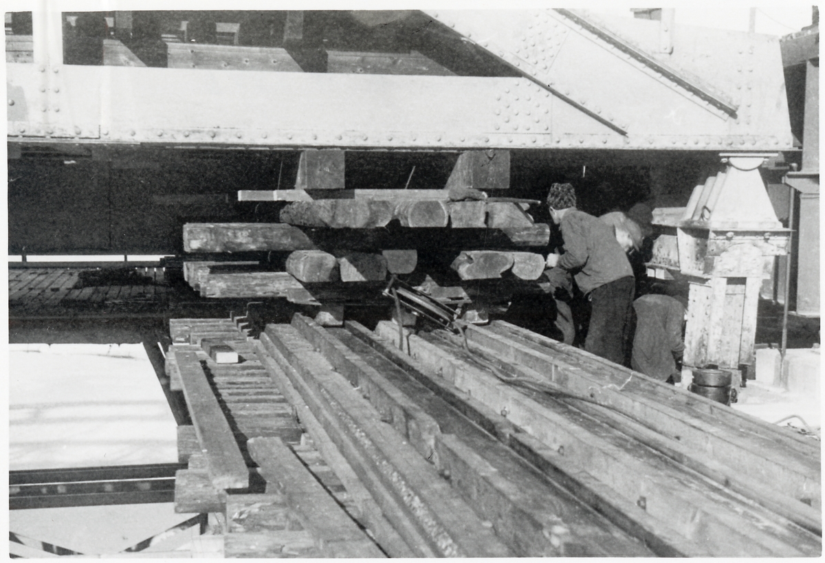 Bron över Skellefteälven på linjen mellan Karsbäcken och Kusfors under ombyggnation. Här ser vi arbetet med att byta mittspann.