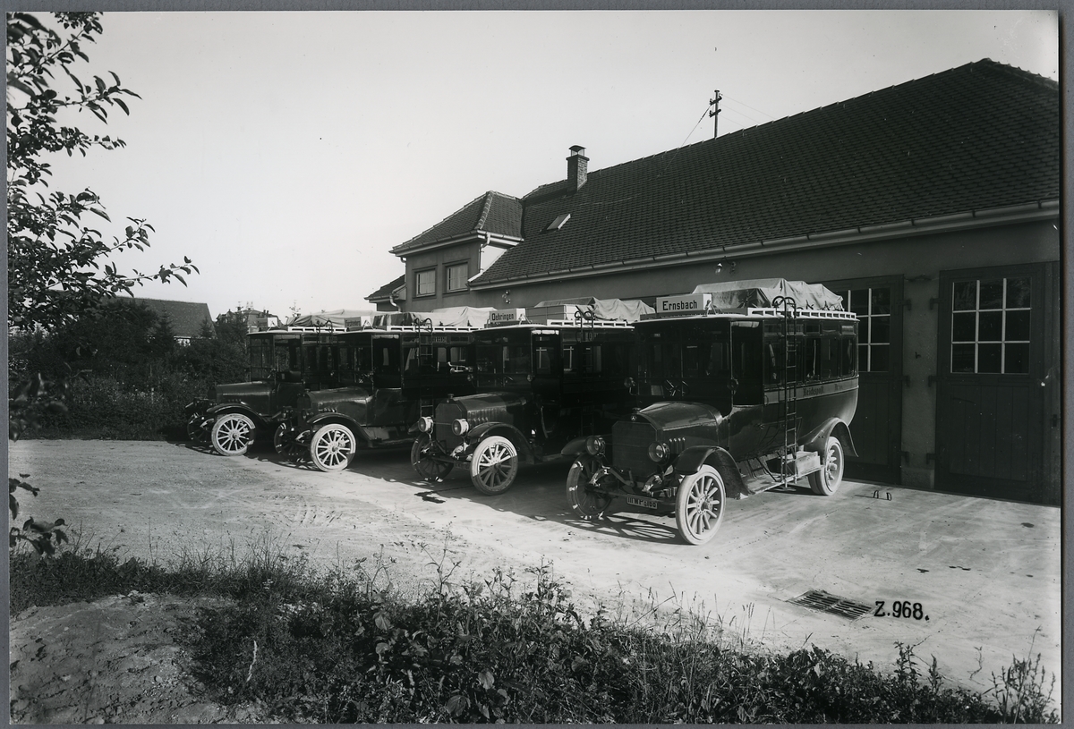Titel: 4 stycken Daimler-Benz utanför bussgarage.