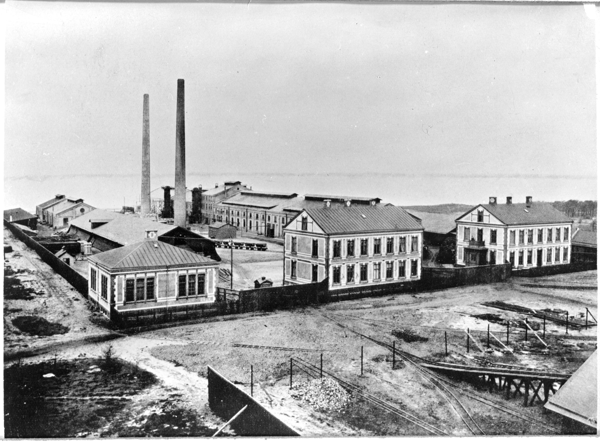 Helsingborgs Kopparverk sett från öster. Mitt i bild ses Helsingborg - Råå - Ramlösa Järnväg, HRRJ fem tippvagnar av tjugo på huvudspåret som går in på området mellan de två likartade husen.