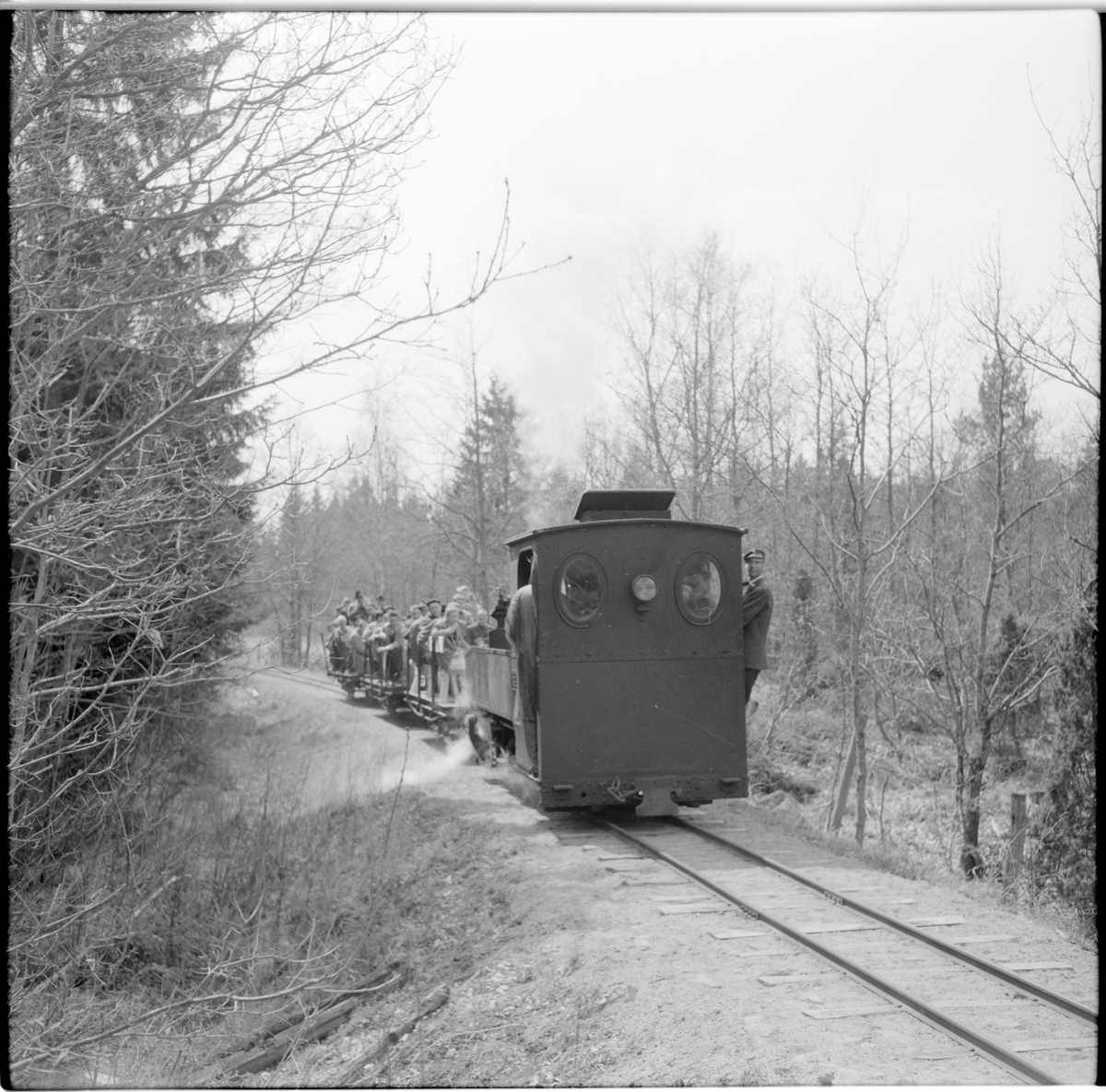 Museijärnväg Östra Södermanlands Järnväg, ÖSlJ. Resande sitter på godsvagnar med bänkar vid en tur med ÖSlJ lok 8 "Emsfors".