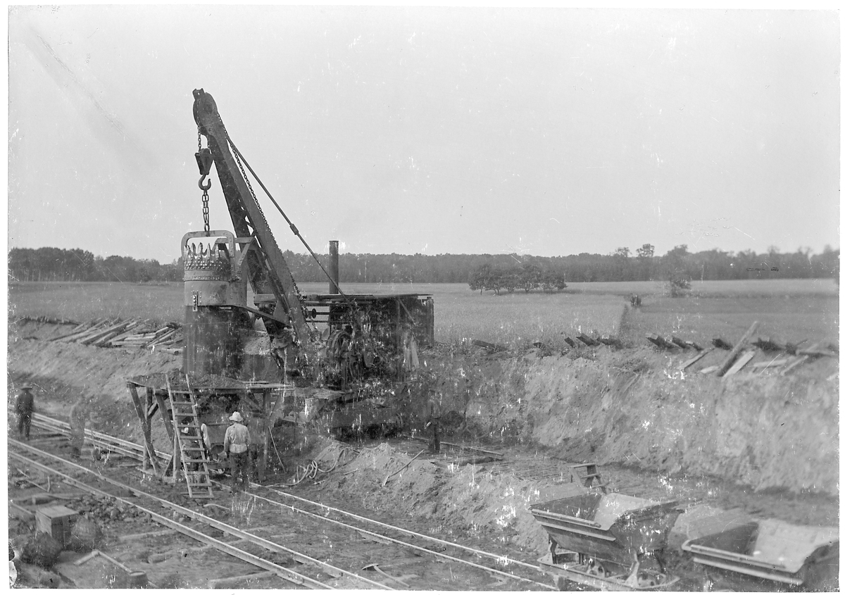 Titel: Banbyggnad i Klippan. På bilden ses en ångdriven lingrävare.