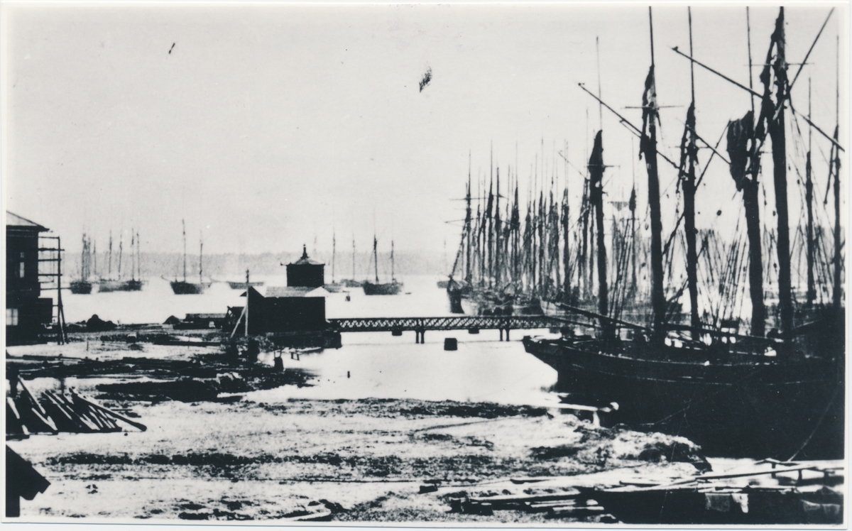Vänersborg. Uddevalla-Vänersborg-Herrljunga Järnväg, UVHJ. Svängbron över hamnkanalen i Vänersborg. Fotot taget den 15 maj 1867, två dagar före UWHJ öppnades för allmän trafik på hela sträckan Uddevalla-Herrljunga. Spårvidd efter engelskt mönster 4 engelsk fot = 1217 mm. Banan breddades till normalspår åren 1898-1899. Borås-Herrljunga Järnväg, BHJ, hade samma spårvidd och breddades samtidigt med UWHJ. Greve Arvid Taube var den förste trafikchefen för båda banorna Borås-Herrljunga Järnväg, BHJ och UVHJ.