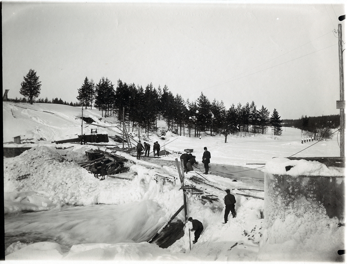 Titel: Järnvägsbron byggs över Piteälven vid Sikfors på linjen mellan Piteå och Älvsbyn.