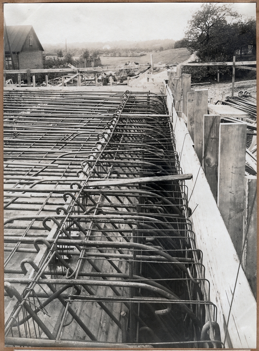 Armering av brodäck och landfästen till vägport av järnbetong i Tredje Avenyen, Hässleholm. Oktober 1917.
